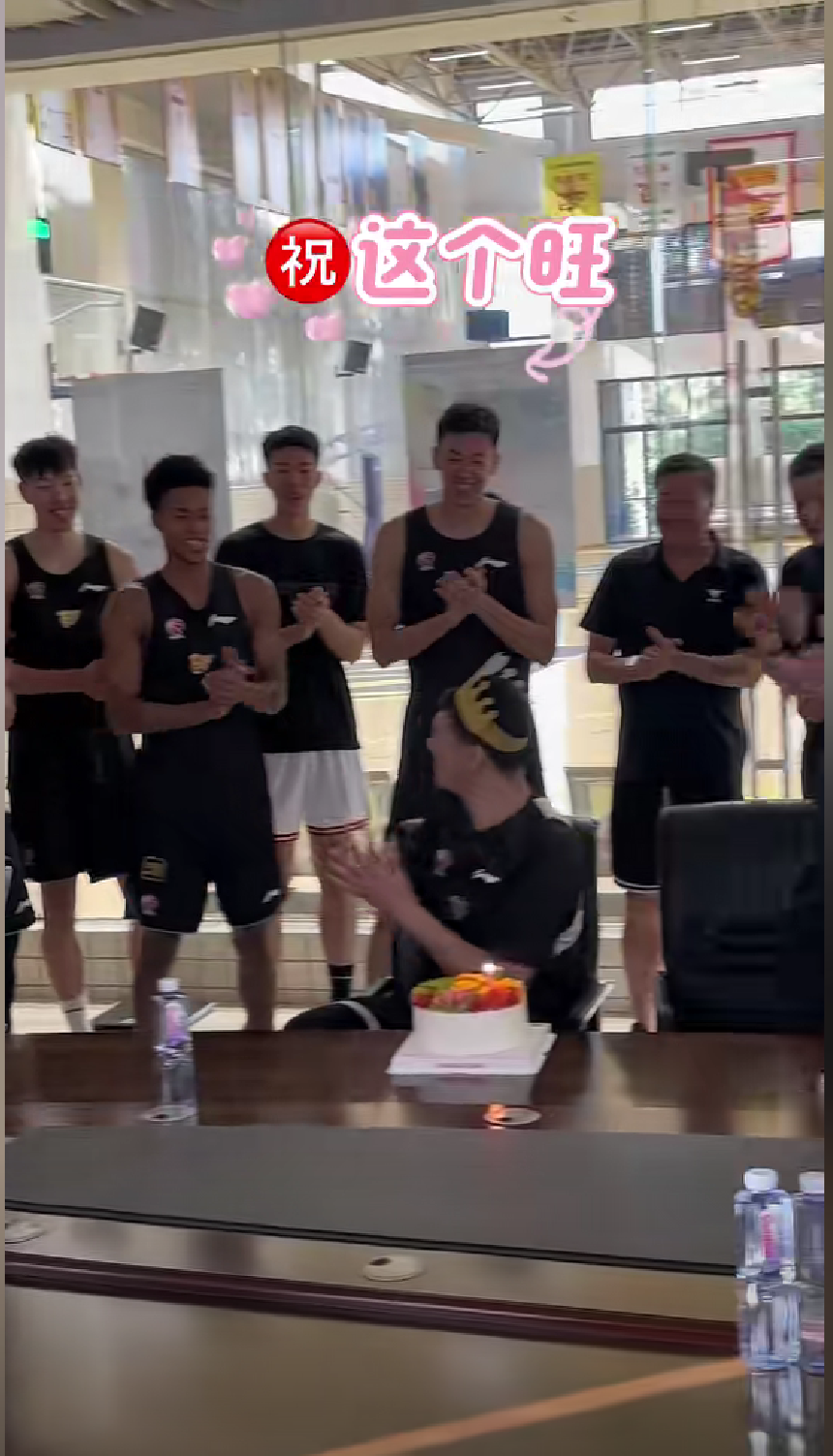 “寿星”杜润旺戴上了生日帽,一脸警惕地扭头看着队友们,因为他知道,随时都可能被队友拍蛋糕。