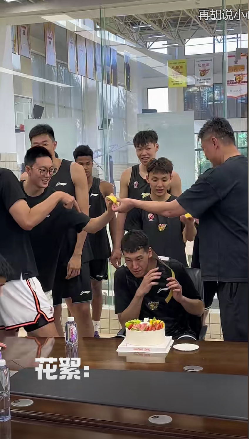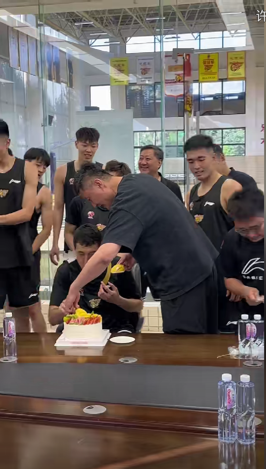 广东宏远主教练杜锋上前先帮弟子整理一下生日蛋糕上的水果。